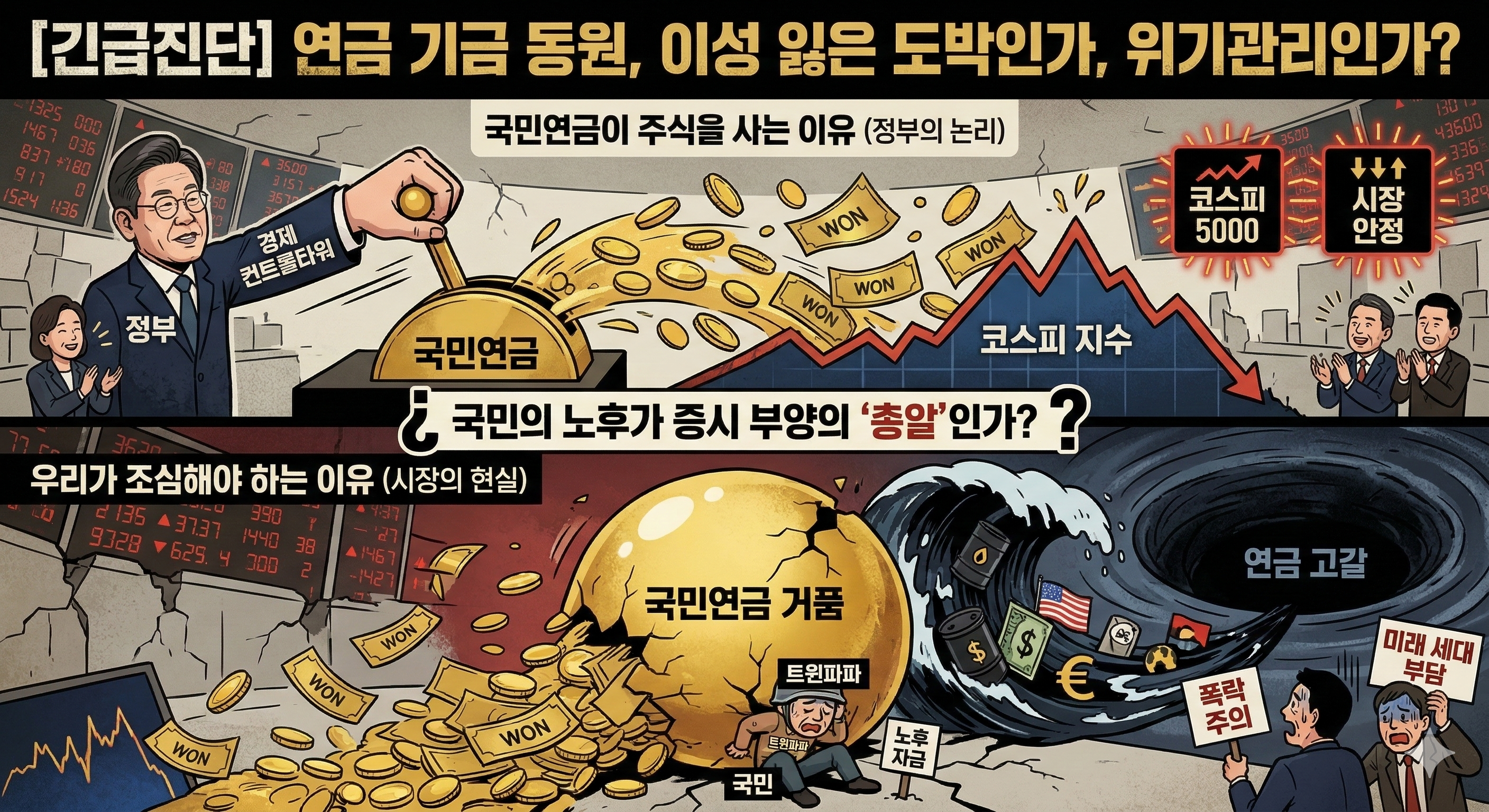지금처럼 대외 변수로 시장이 요동치고 거품 붕괴 신호가 선명한 상황에서 연금 기금을 쏟아붓는 것은 매우 위험한 도박입니다.